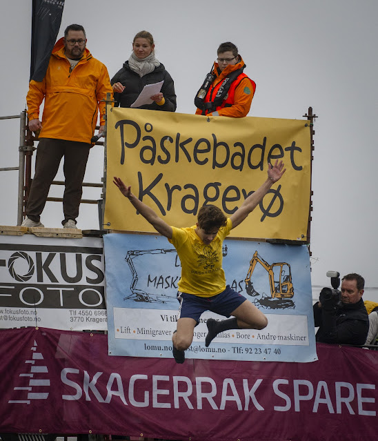 Påskbadet i Kragerø er blitt en tradisjon som arrangeres på påskeaften og markerer starten på årets badesesong. Selv med grått vær var det mange mennesker i byen denne dagen og en vanntemperatur på 3.2 grader så ikke ut til å skremme de mange deltagerene. |